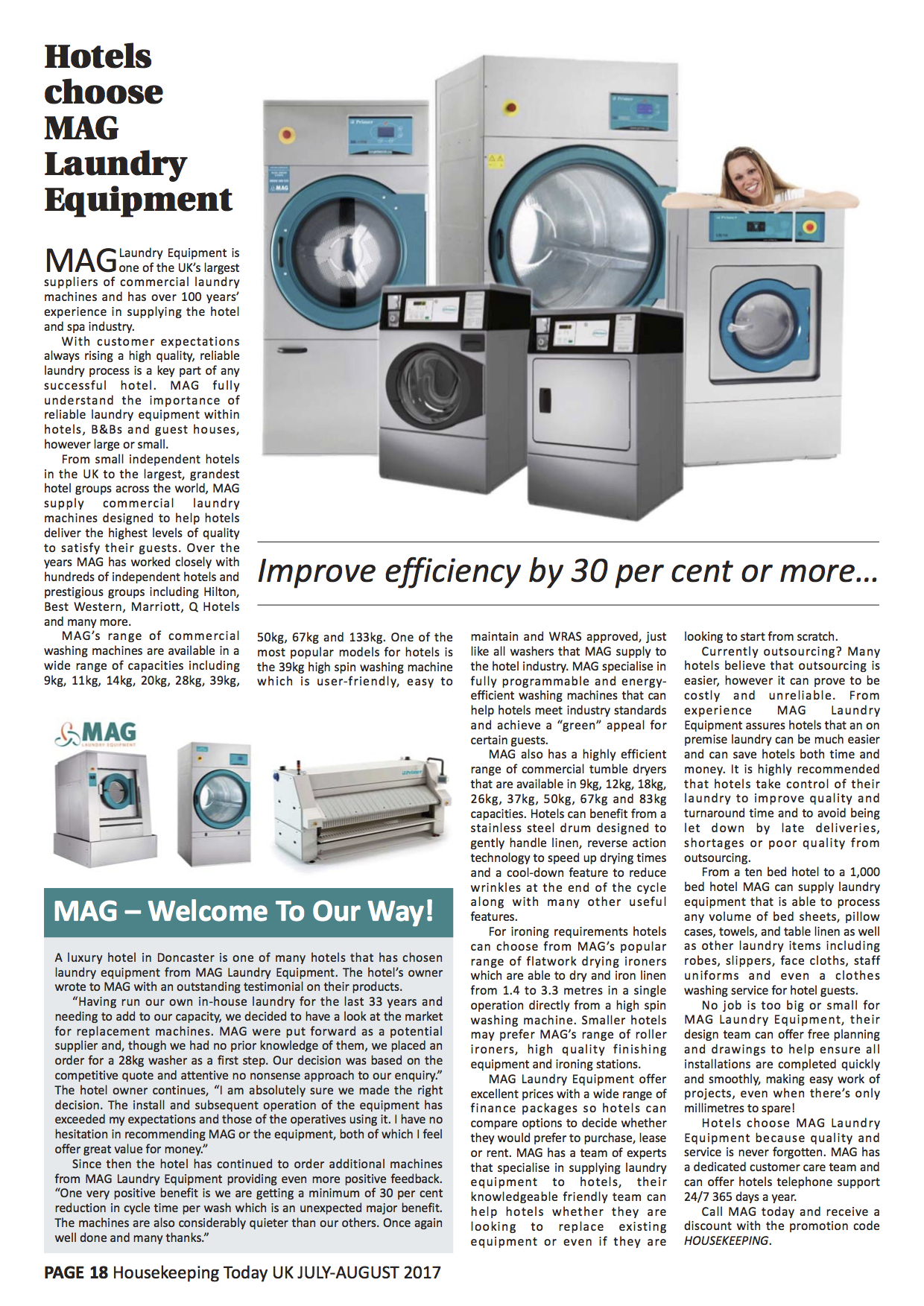 MAG Laundry Equipment is one of the UK’s largest suppliers of commercial laundry machines and has over 100 years’ experience in supplying the hotel Always rising a high quality, reliable laundry process is a key part of any successful hotel. MAG fully understand the importance of reliable laundry equipment within hotels, B&Bs and guest houses, however large or small.